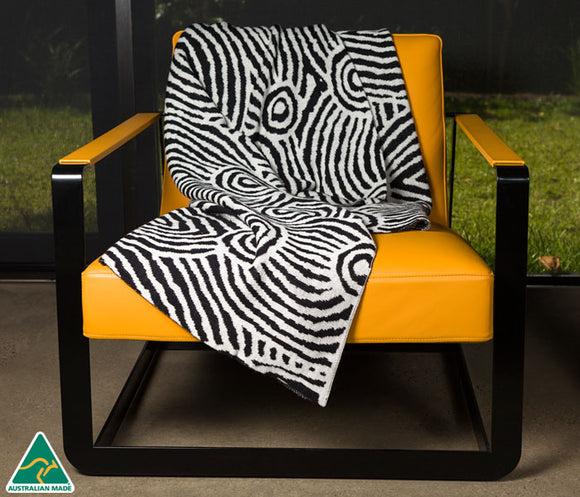 Made in Australia from Australian Merino Wool.Based on Aboriginal Artwork by Paddy Stewart (Yuendumu Doors).Throw comes with information about the artist and artwork.Size: 100cm x 160cmRoyalties from this product directly...