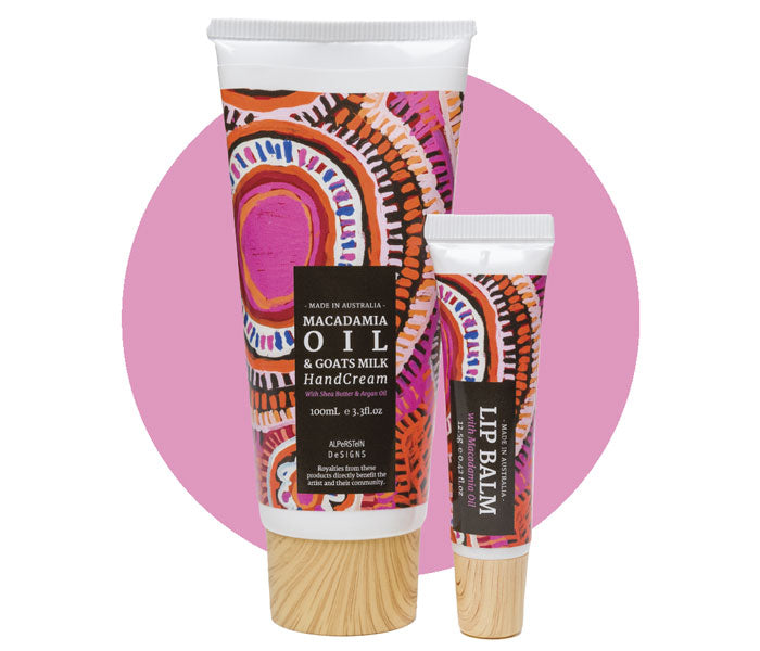 Indulge your senses with Australian made handcream and lip balm featuring Aboriginal artwork by Murdie Morris from Warlukurlangu Artists in Central Australia. Gift Packed in a matching neoprene case this is the perfect gift to give or indulge in yourself.