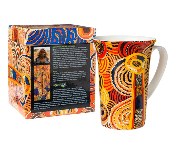 Royalties from this product directly benefit the artist. Fine Bone China MugDishwasher SafeMicrowave SafeMug Height - 12.5cmBased on artwork by Judy Napangardi Watson from Warlukurlangu Artists of Yuendumu, Australia.Presented in a...