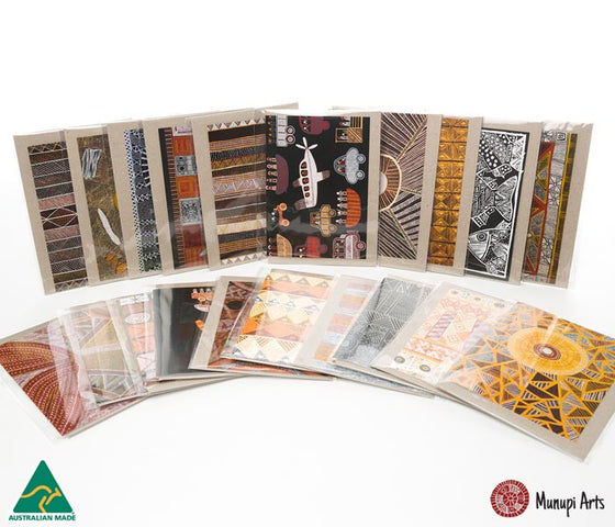 Fantastic gift cards featuring artworks by artists from Munupi Arts on the Tiwi Islands. Cards are blank inside so you can write something special inside. On the back of the card is information about the artist, artwork and art centre.