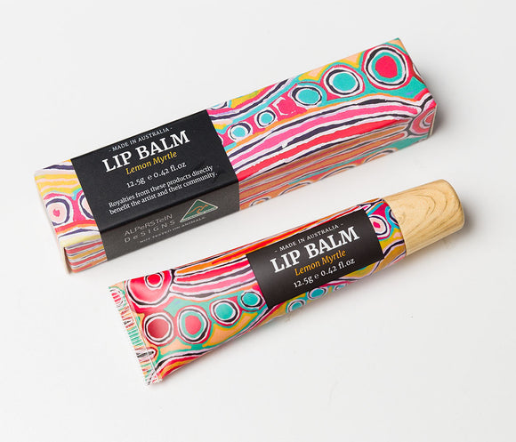 Lemon Myrtle Lip Balm.Lanolin base. Features artwork by Judy Napangardi Watson from Warlukurlangu Artists in Central Australia. 12.5g (0.42fl.oz) Made in Australia Not tested on Animals Royalties from this product directly benefit the artist.
