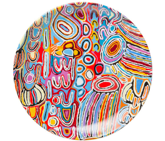 Royalties from this product directly benefit the artist. 7.5" Fine Bone China Plate.Perfect size for entertaining or even displaying on the wall!Based on artwork by Judy Napangardi Watson from Warlukurlangu...