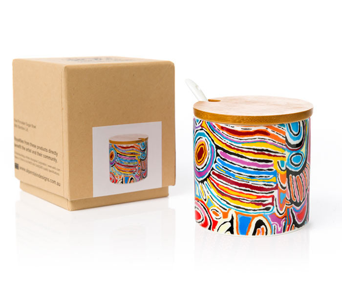 Royalties from this product directly benefit the artist. Fine Porcelain Sugar Bowl with Bamboo LidIncludes White Porcelain Spoon.Dimensions: 8.5cm diameter. Height: 8cm (including lid).Box dimensions: 9.5cm x 9.5cm x 10.5cmBased...