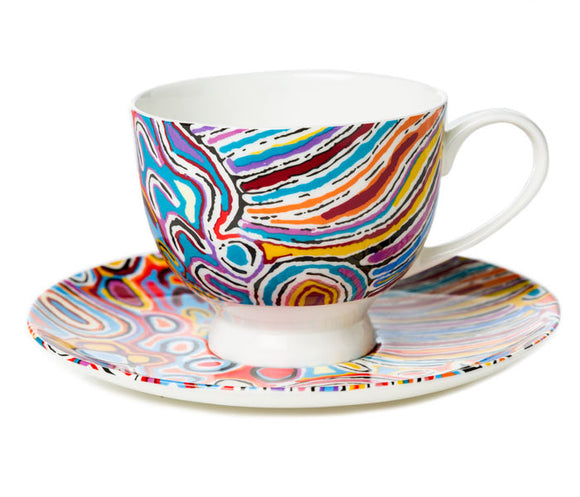Royalties from this product directly benefit the artist. Fine Bone China Tea Cup & SaucerDishwasher SafeMicrowave SafeCapacity: 160ml.Based on artwork by Judy Napangardi Watson from Warlukurlangu Artists of Yuendumu, Australia.Presented in...