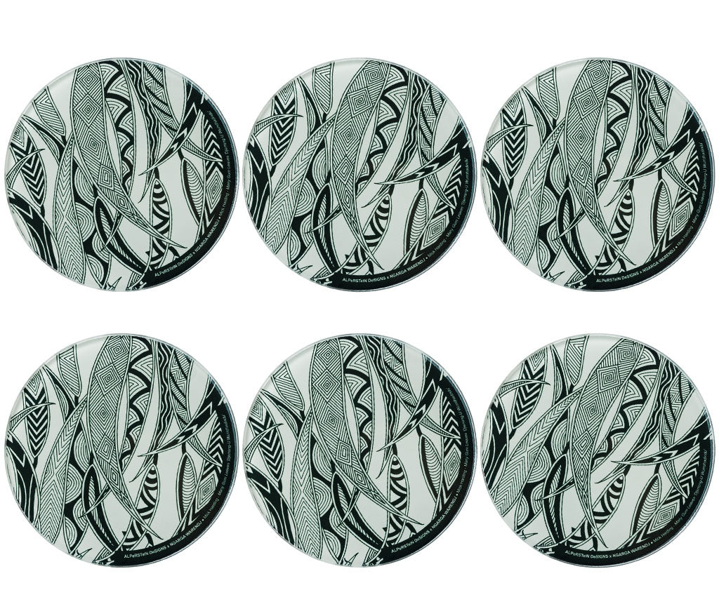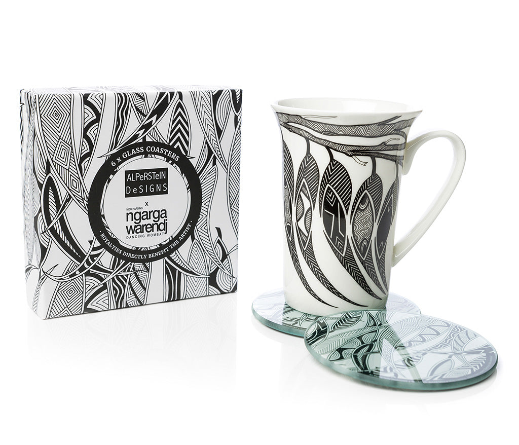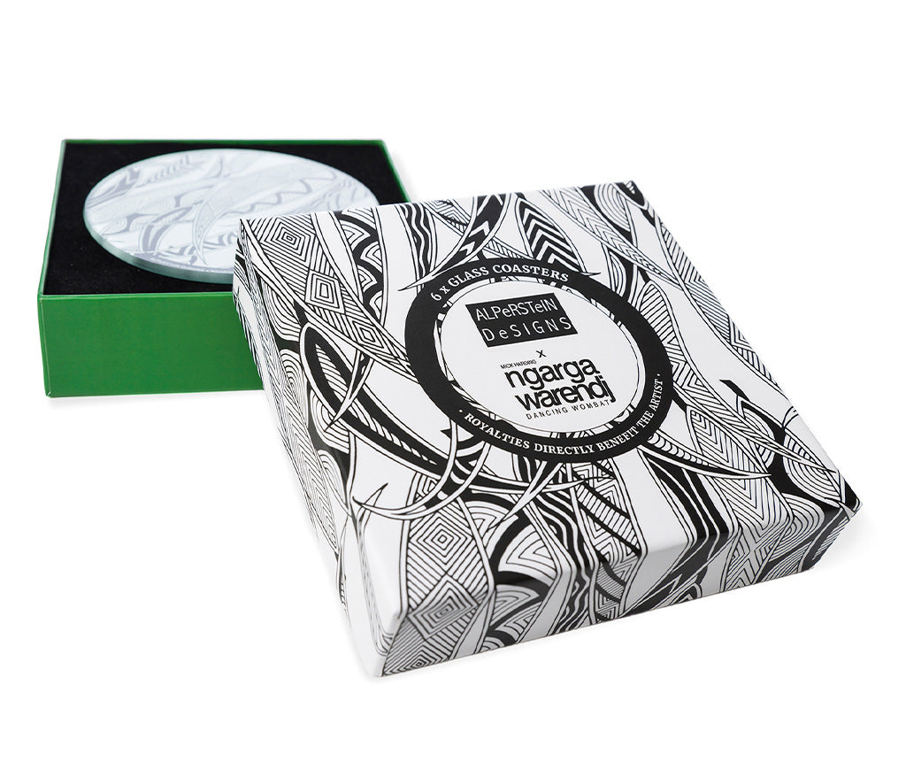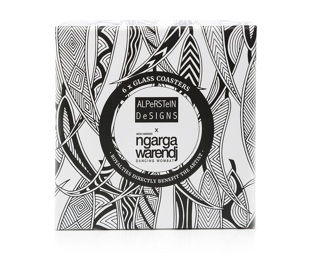 Make a lasting impression with this set of 6 Aboriginal Art glass coasters. The vibrant art design on the coasters is sure to brighten any home, and the included gift box makes this an ideal present. Give the gift of art today! Featured artwork: 'many Gumleaves 'Djerrang-U Wurrdhadindu' by Mick Harding, Ngarga Warendj (Dancing Wombat). Gift boxed - set of 6 glass coasters. Coaster Dimensions: 10cm Includes information about artist and artwork.