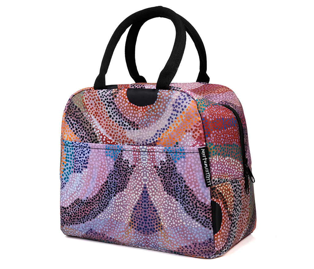 Insulated lunch totes are a great way to keep your lunch cooler for longer. Insulated lunch totes have zip access at the top for easy access and slip pocket on the front. Featuring artwork, reproduced under license by Marianne Burton, courtesy Martumili Artists.