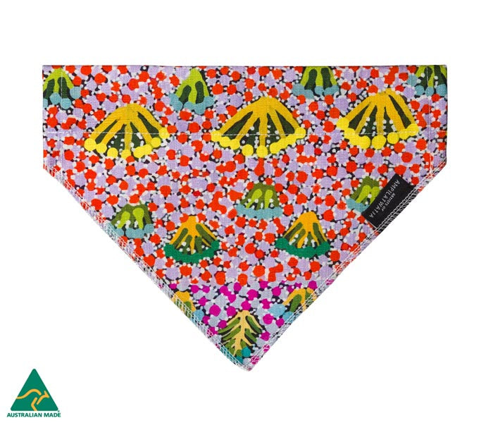 If your pet wears a collar then they can wear one of our 100% Cotton Pet Bandanas. Made in Australia, pet bandanas feature incredible artworks reproduced under license from Artists of Ampilatwatja in the Northern Territory. These pet bandanas are worn on the collar rather than the neck so one size fits most!