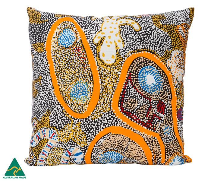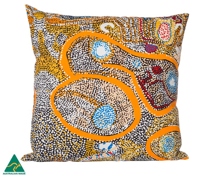 Australian Made Cotton Cushion Cover featuring licensed artwork by by Elaine Lane from Papulankutja Artists located at Blackstone, Western Australia.