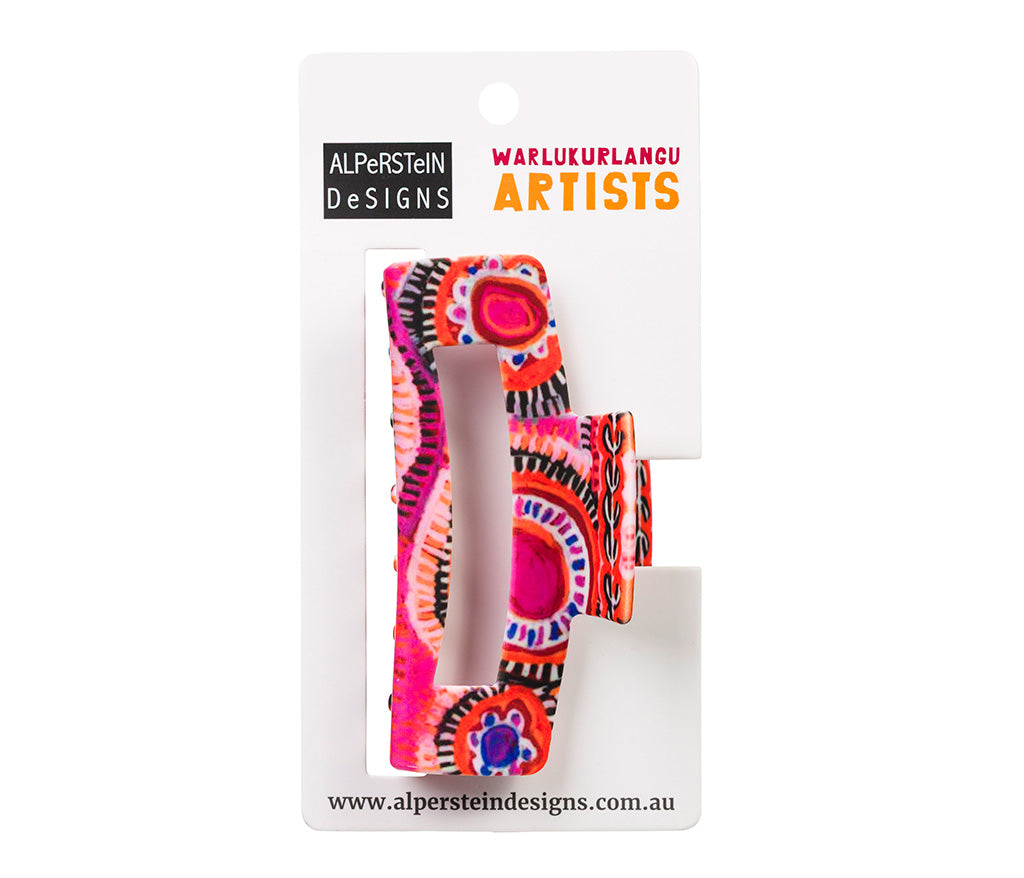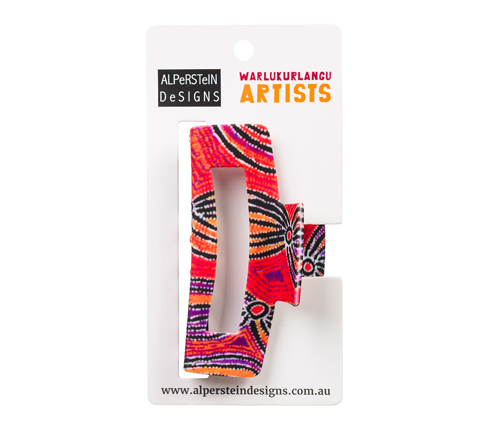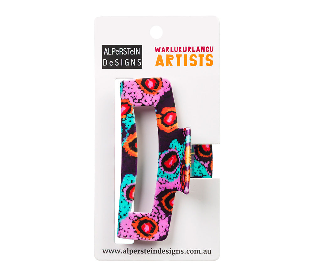 Add a fun twist to your hair game with our new Hair Claws featuring artworks from Warlukurlangu Artists! These stylish clips hold your locks in place with a snap, perfect for those quick fixes or bold styles.