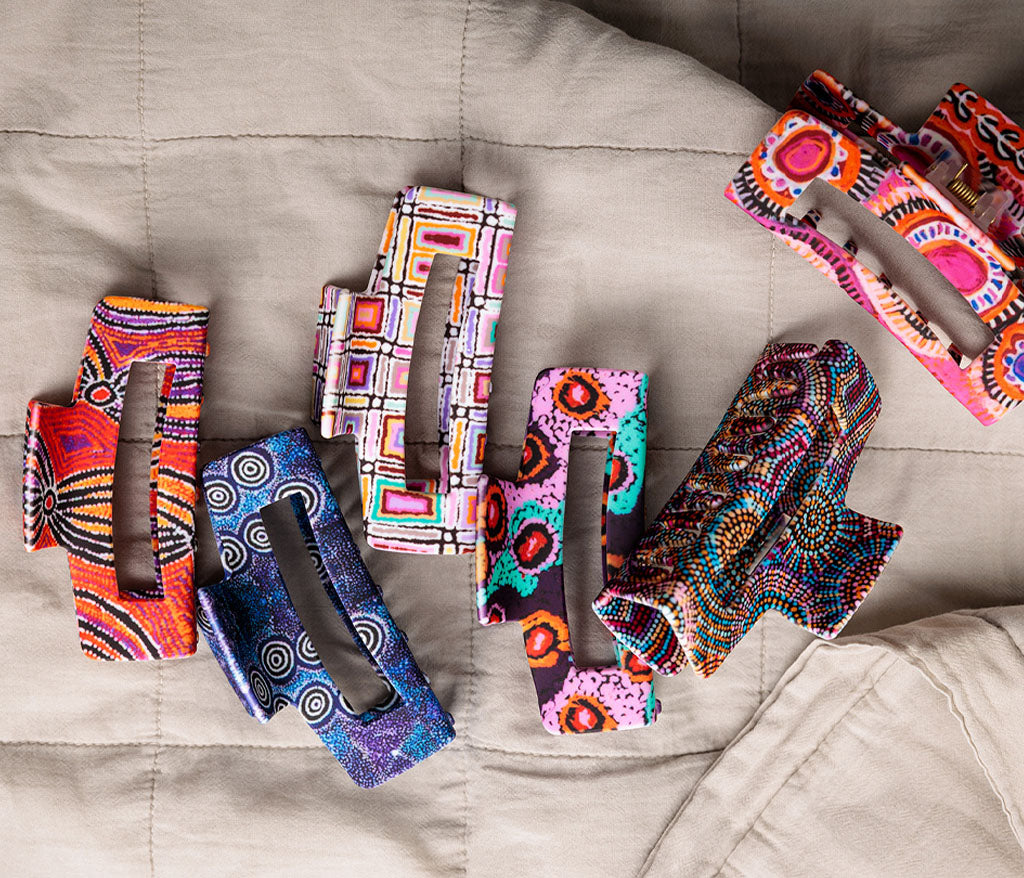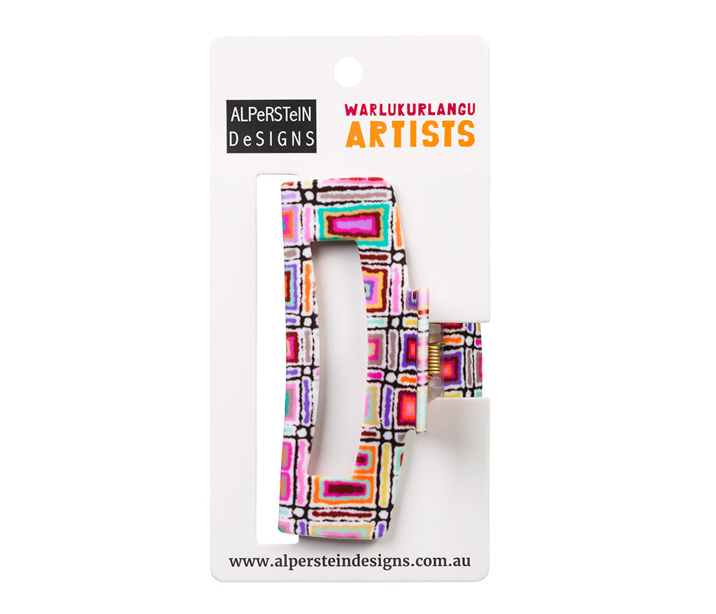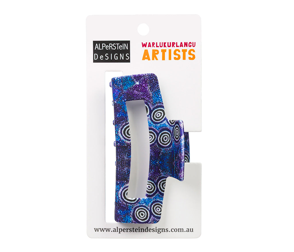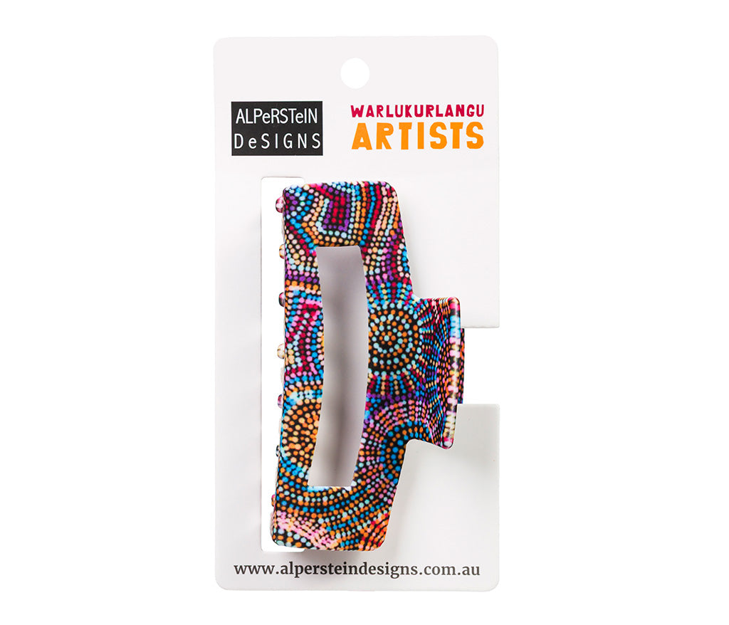 Add a fun twist to your hair game with our new Hair Claws featuring artworks from Warlukurlangu Artists! These stylish clips hold your locks in place with a snap, perfect for those quick fixes or bold styles.