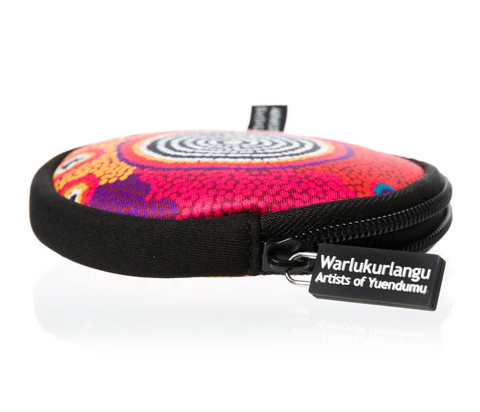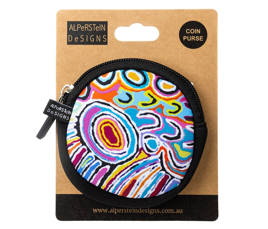 Neoprene Coin PurseDimensions: Approx 11cm diameterZip ClosureHang sell headerCoin Purse.Great to keep all your coins but you can use for all sorts of things like cables or cards.Based on artwork by Judy Napangardi Watson.Includes information about the artist and artwork (swing tag).