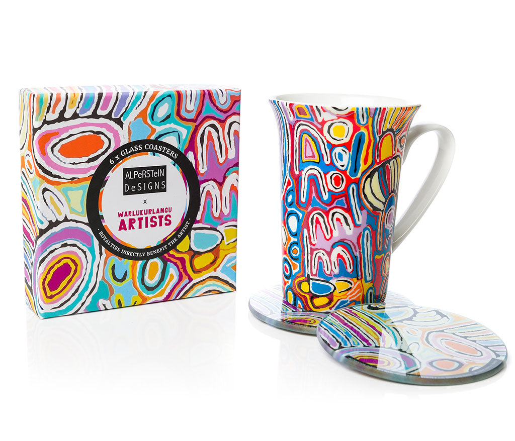 Make a lasting impression with this set of 6 Aboriginal Art glass coasters. The vibrant art design on the coasters is sure to brighten any home, and the included gift box makes this an ideal present. Give the gift of art today! Featured artwork: 'Mina Mina Jukurrpa - Ngalyipi' by Judy Napangardi Watson courtesy Warlukurlangu Artists. Gift boxed - set of 6 glass coasters. Coaster Dimensions: 10cm Includes information about artist and artwork.