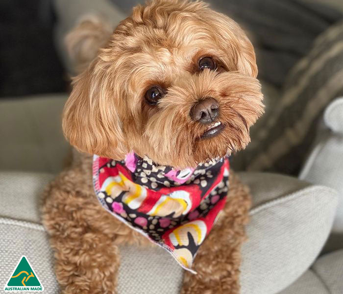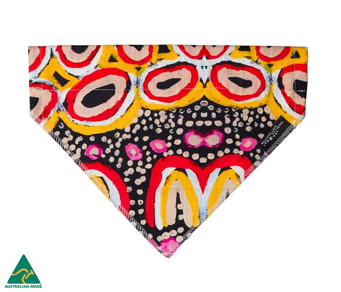 If your pet wears a collar then they can wear one of our 100% Cotton Pet Bandanas. Made in Australia, pet bandanas feature incredible artworks reproduced under license from Yarliyil Art Centre In Halls Creek, Western Australia. These pet bandanas are worn on the collar rather than the neck so one size fits most!