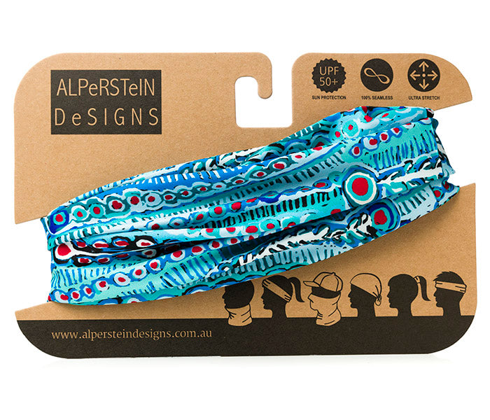 With so many ways to wear your neck gaiter and so many activities to wear them at, these neck gaiters are great for when you are out and about. Whether it's fishing or riding, skiing or running or just out for the day! Head out in style! Neck Gaiters are UPF 50+ for extra protection from the elements. Available in assorted designs, including featured artwork, reproduced under license by Murdie Nampijinpa Morris from Warlukurlangu Artists from the remote desert communities of Yuendumu and Nyirripi in Central Australia.